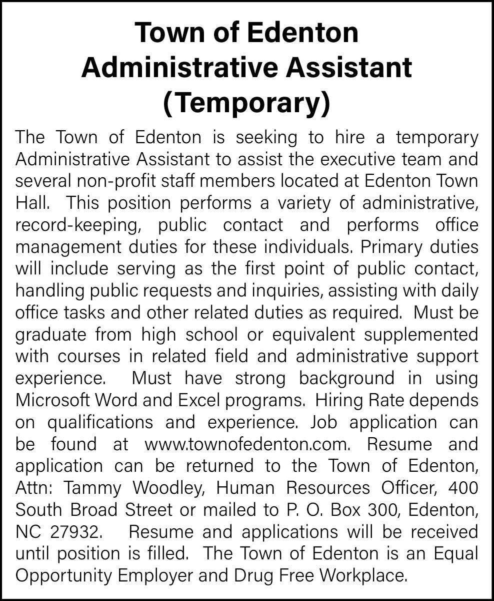 Oct 11, 2025. Town Of Edenton Administration Jobs from Chowan Herald