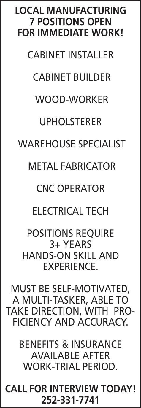 Cabinet Installer - Cabinet Builder - Wood Worker - Upholsterer - Warehouse Specialist