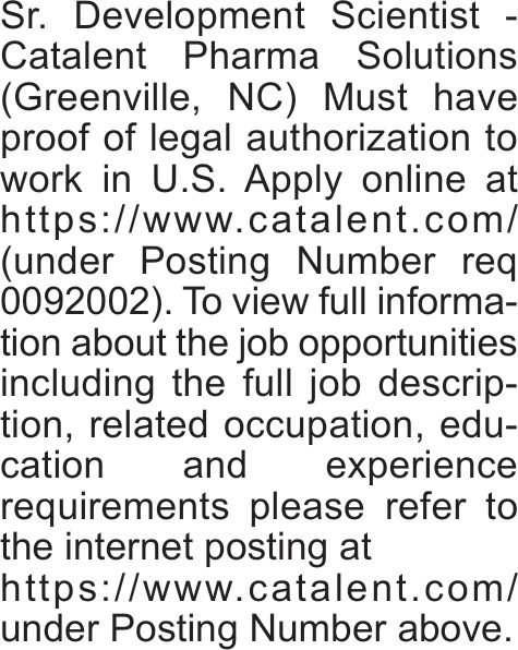 Dec 13, 2025. Catalent Pharma Solutions Scientist Jobs from The Daily Reflector