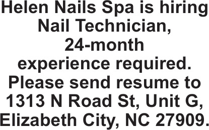 Jan 08, 2026. Helen Nails Spa Technicians Jobs from Chowan Herald