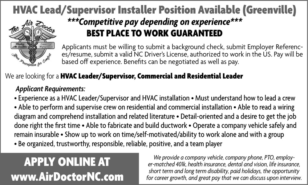 Jan 24, 2026. The Air Doctor, Inc Technicians Jobs from The Daily Reflector