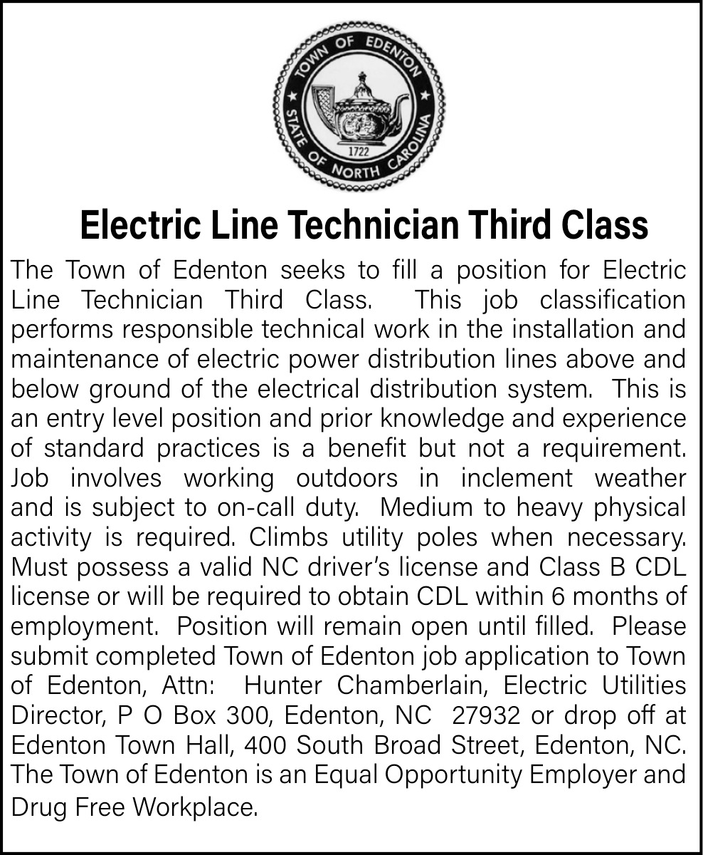 Feb 14, 2026. Town Of Edenton Electrician Jobs from Chowan Herald