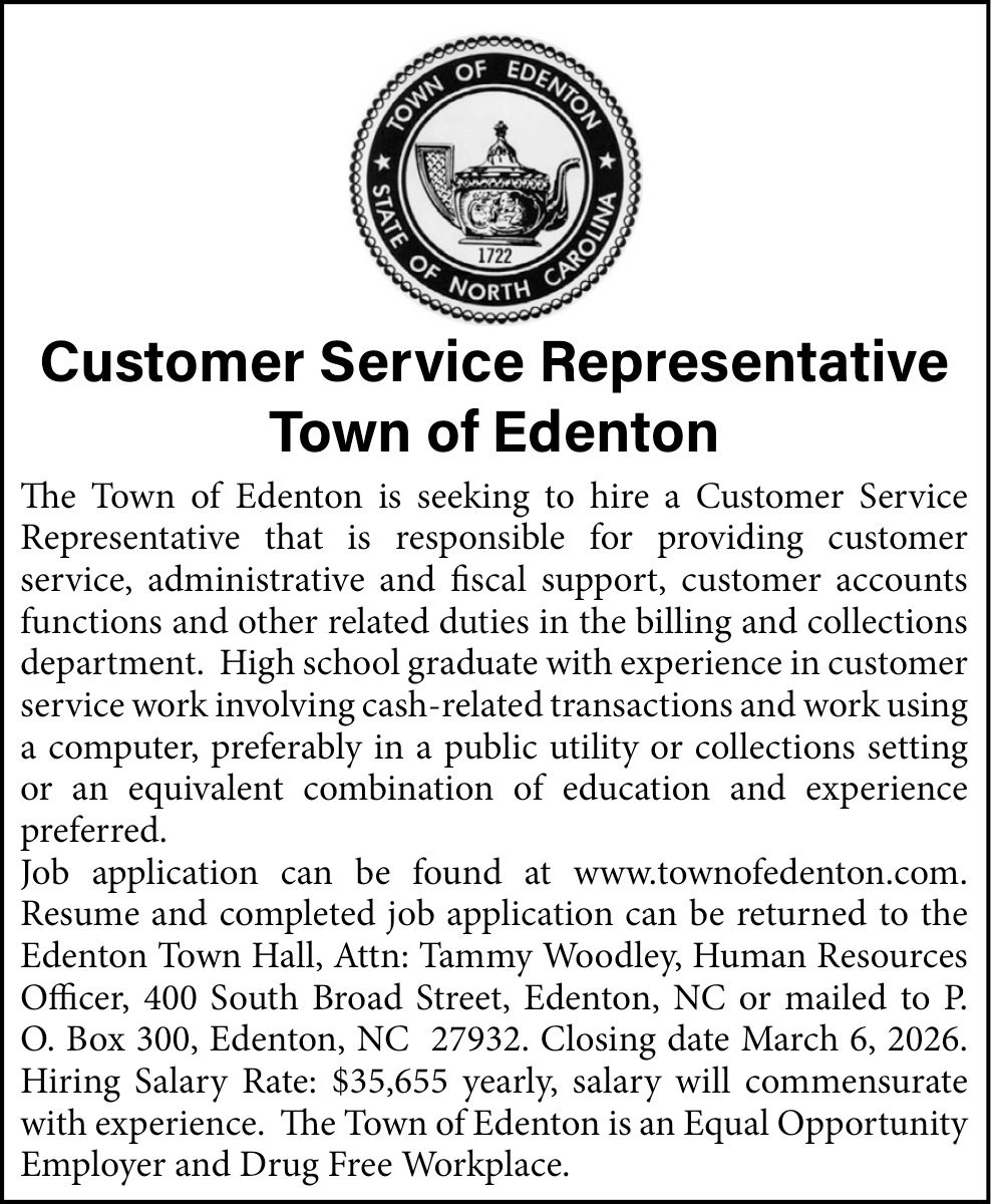 Feb 28, 2026. Town Of Edenton Customer Service Jobs from Chowan Herald