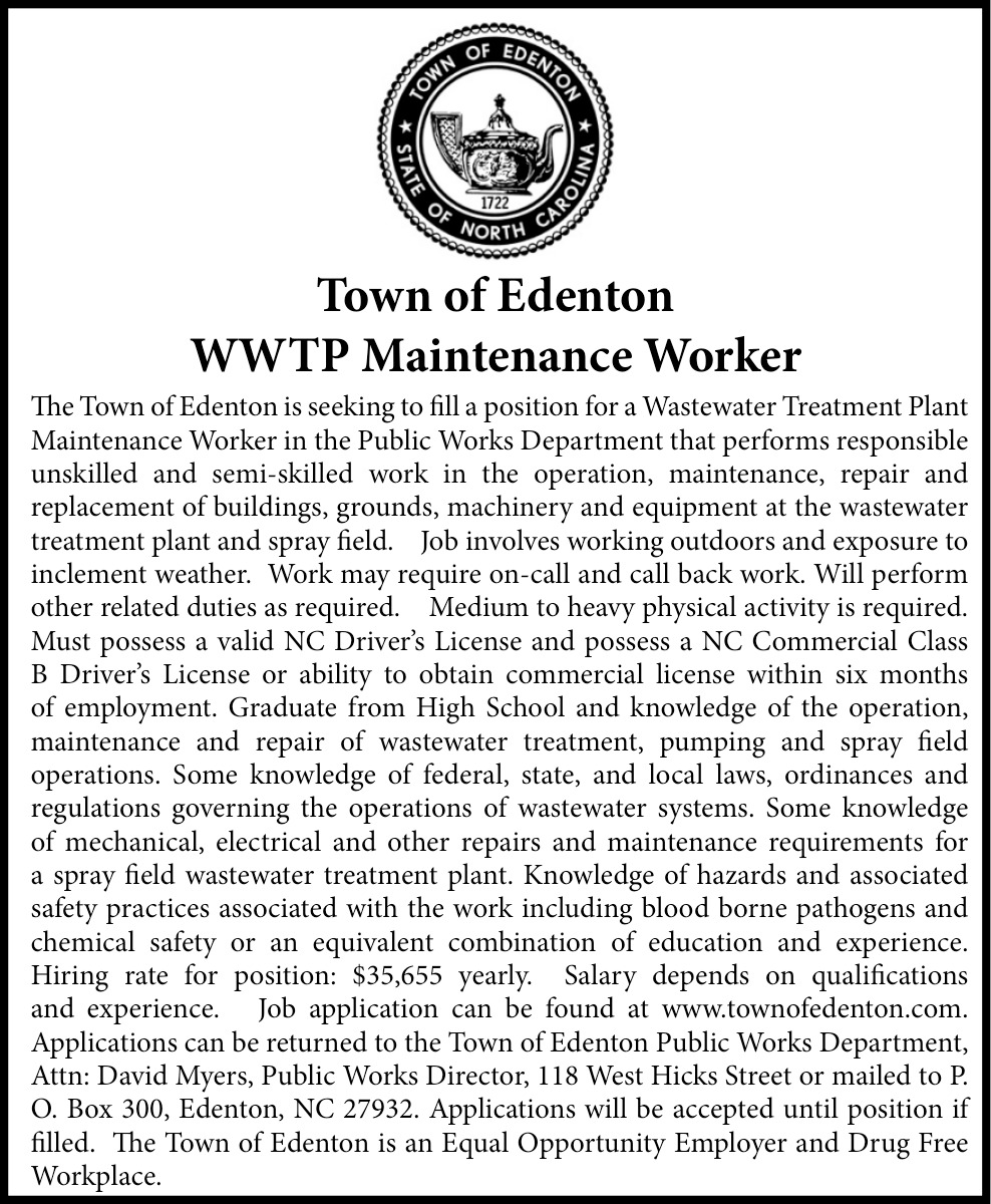 Apr 25, 2026. Town Of Edenton Maintenance Jobs from Chowan Herald