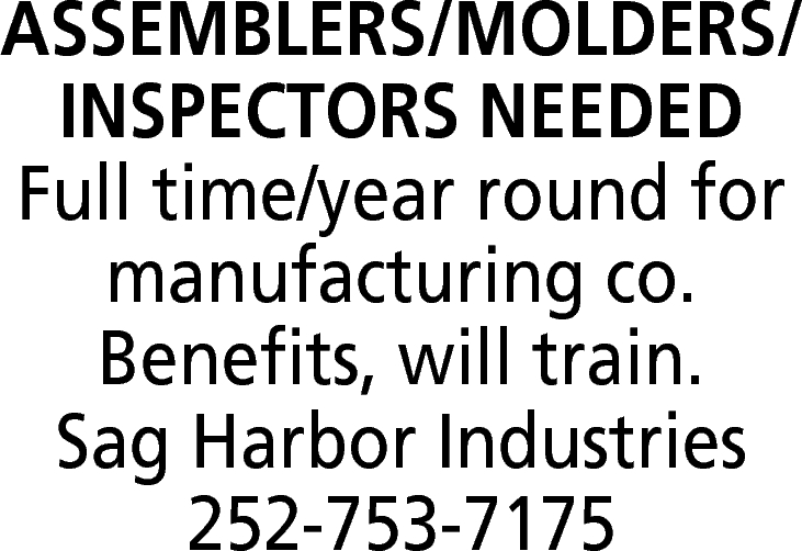 Apr 02, 2023. Sag Harbor Industries, Inc. Assemblers Jobs from The Daily Reflector